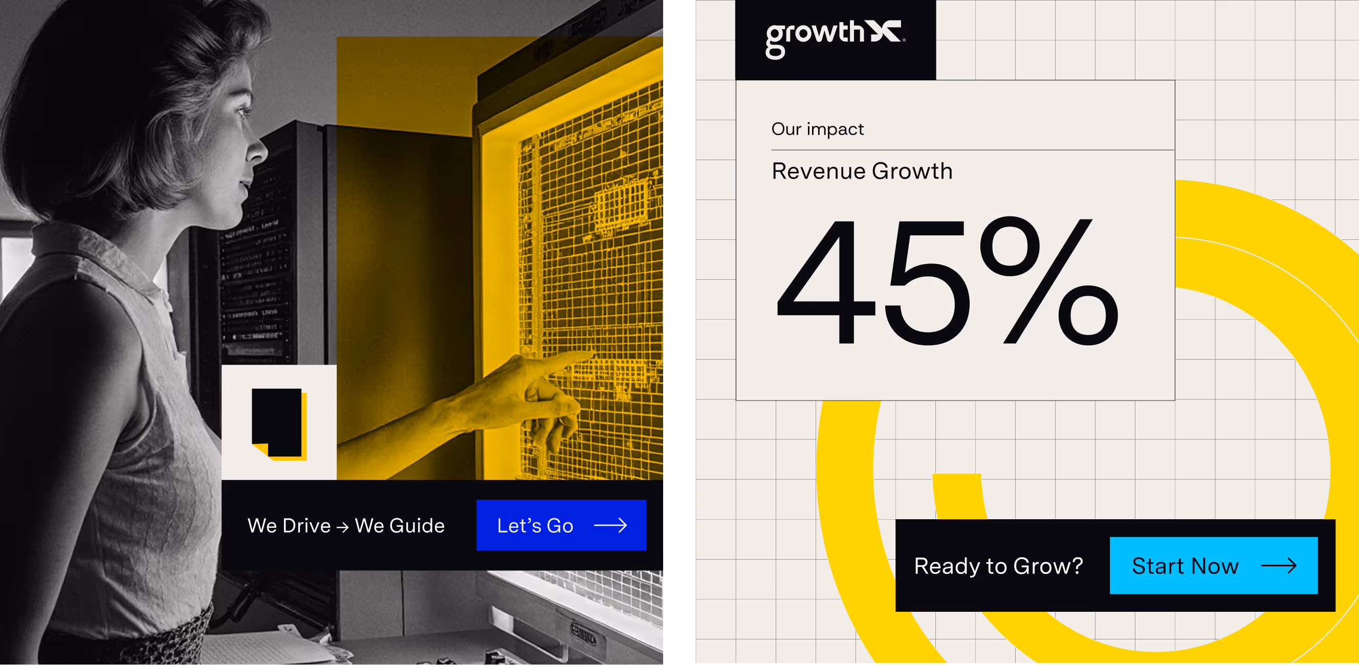 From there, we built a broader visual system rooted in contrast. GrowthX sits between technology and human ingenuity, so the identity needed to reflect that balance. With clean grids, minimal layouts, and a modern typographic structure, we provided a sense of technical rigor. Alongside them, we infused retro-inspired imagery and analog references for warmth and personality.